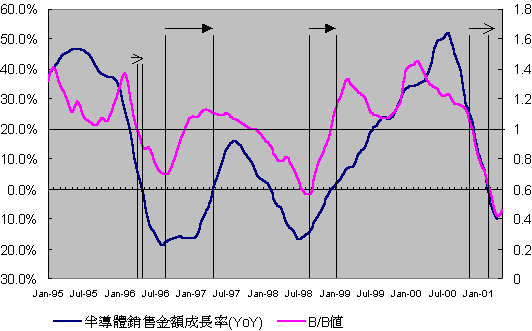 就B/B值與半導體市場的成長率作觀察,可以發現在1996年4月與1997年12月低於1後,整個半導體市場景氣亦分別在1996年5月與1998年3月開始呈現負成長的情況。而當B/B值從1996年9月與1998年8月的最低點開始上升後,卻也形成了整體市場向上成長的先兆,除了整個市場成長率開始逐漸上升,整個市場景氣亦分別在1997年5月與1999年1月正式反轉。