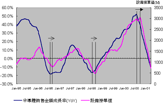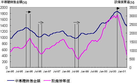 因此若把B/B值中的設備接單值與半導體市場的銷售金額絕對值之高低做一比較,則可以發現半導體銷售金額之高低為領先指標。