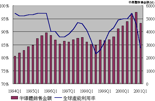根據WSTS的統計,全球半導體廠商的產能利用率已從2000年第四季的93%開始下滑,2001年第一季更下滑至83.7%以下,預估第二季的產能利用率約75%,依據過去的數據顯示:產能利用率從頂點滑落至底點大約需要3到4季的時間,例如1995年第四季為96%的利用率,1996年第三季末則為77%。而2000年的產能利用率高點約出現在第三季末與第四季初,因此今年2001年的產能利用率谷底約出現在第二季末至第三季左右的時間,第三季全球半導體廠商的平均產能利用率將低於70%。
