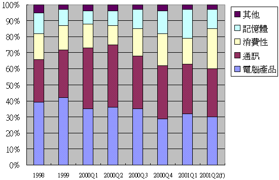 ¥x¿n¹q1998¦~»P1999¦~¥N¤u²£«~ªº¤ñ«¤¤¡A¤´¥H¹q¸£¬ÛÃö²£«~¬°¥D¡A¤À§O¦û39%»P42%¡A2000¦~«h¥[±j¦b³q°T¬ÛÃö²£«~ªº¤ñ«¡A¦]¦¹¾ãÅé¦Ó¨¥¡A¦b2000¦~ªº²£«~¤ñ«¤¤¡A³q°T²£«~§¡¶W¹L¹q¸£¬ÛÃö²£«~¡A¨ä¤¤¦b2000¦~²Ä¥|©u¡A¹q¸£²£«~ªº¤ñ«§ó°¦Ü29%¡A¬°¾ú¦~¨Óº¦¸§C©ó30%¡C¦Ó¦b2001¦~²Ä¤@©u¡A¦]¬°Ó¤H¹q¸£ªºµu¼È¶R®ð¦^¤É¡A«e¤T¤j«È¤á¤§¤@ªº«Â²±ªº¥X³f¶q¤Ï¦Ó¤ñ2000¦~²Ä¥|©u¬°°ª¡A¦]¦¹¥x¿n¹q¦b¹q¸£¬ÛÃö¥N¤u²£«~ªº¤ñ«¦^¤É¦Ü32%¡A¦ýÀHµÛ´¹¤ù²Õ¼t°Ó²Ä¤G©uÀ禬¸û²Ä¤@©u°I°hªº±¡ªp¤U¡A§ëÅU¹w¦ô¹q¸£²£«~ªº¤ñ«±N¤U·Æ¦Ü30%¥ª¥k¡C¦Ü©ó°O¾ÐÅé²£«~¦pSRAM»PDRAMªº¤ñ«¦b2001¦~²Ä¤@©uªº¤ñ«´£°ª¦Ü18%ªºªÅ«e¤ô·Ç¡A¦ý§ëÅU¹w¦ô¦b½Ñ¦h°O¾ÐÅé³]p¼t°Ó²Ä¤G©uªºÀ禬¤j´T°I°h»P¦s³f¤´°ªªº±¡ªp¤U¡A¹w¦ô²Ä¤G©u¦³Ãö°O¾ÐÅ骺¤ñ«±N°§C¦Ü12%¥ª¥k¡C