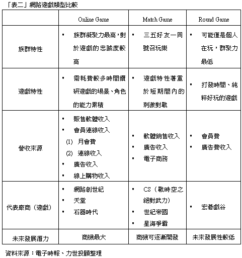 Y´N¸gÀç·~ªÌ¦¬¶O¤è¦¡¨Ó¤ÀªR¡A¥H²Ä¤@Ãþªº¡yOnline Game¡]½u¤W¤d¤H¹ï¾Ô¹CÀ¸¡^¡z¦¬¤J¨Ó·½³Ì¼s¡A·~ªÌ°£¤F¥i¥HÂǥѾP°â¹CÀ¸³nÅéÀò¨ú¦¬¤J¥~¡A©|¥i³z¹L«áÄòªººô¸ô³s½u¨ÓÀò¨ú·|ûªº¤ë¶O©ÎÁʶRÂI¼Æ¥dªº¦¬¤J¡A¦¹¥~¡AÀHªÌ·|û¤H¼Æªº«ùÄò¼W¥[¡A¥Ñ©óª±®aªºªÀ¸sÀÀ»E®ÄªG¡AÄ~¤§¦Ó¨Óªº¼s§i¦¬¤J¡B½u¤W¹s°âµ¥¦¬¤J¥H¤Îºô©@ªº±ÂÅv¦¬¤JѺª`¥ç¬Û·í¥iÆ[¡CÂǥѺô¸ôªºµL¦a°ì©Ê¡BµL®É¶¡¨î©Ê¡Bª±®a¸s»E©Ê¡A¥i¥Hµo®iªº°Ó¾÷¬Û·í¦h¡A¦]¦¹¥¼¨Ó¨ã³Æ¬Û·íªºÀò§Q·Q¹³ªÅ¶¡¡C