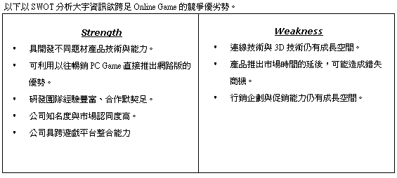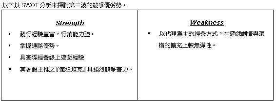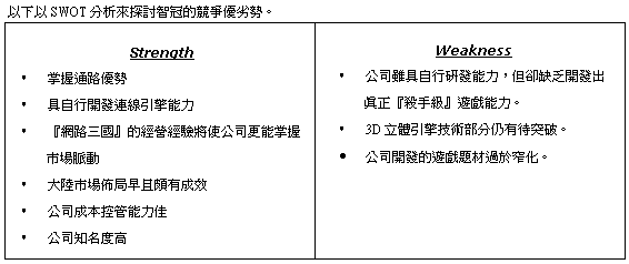¤½¥q¦b¹CÀ¸·~¬ÉµL½×¬O¦b¦Û»s¯à¤O¡B³Ð·sÃD§÷¶}µo¡B¬ãµo¹Î¶¤ªºÂ×´I¸gÅç»P¦X§@Àq«´¬Òº©}¤@«ü¡A©Ò¥Xª©¹CÀ¸¦bª±®aµû»ù¤W¥çÀò±o¬Û·í¤jªº»{¥i»P´Á«Ý¡C¦Ó¤½¥q¦b¸ó¥¥x¾ã¦X¯à¤O¤W¥ç¦³¬Û·íµ{«×¶i®i¡A¥Ø«e¤w¨ã³Æ¶}µo¦bPC¡BTV¤Î¥iÄ⦡¥¥xªº¾ã¦X¯à¤O¡CPC¹CÀ¸¤WªºÀu¶Õ¬O§_¥i²¾´Ó¦Ü¤½¥qªººô¸ô¹CÀ¸§G§½¤W±N¬O¤½¥q©Ò±Á{ªº³Ì¤j¬D¾Ô¡A¦bºô¸ô¹CÀ¸¤W¡A¤½¥q¥Ø«e©|µLªk¦Û¦æ¶}µo¥X3D¥ßÅé³s½u¤ÞÀº¦Ó¦P·~¤¤¥Ø«e¤w¦³¤½¥q¨ã³Æ¦¹¤@§Þ³N¯à¤O¨Ã±N©ó¤µ¦~¤C¤ë´»°²±À¥Xºô¸ô¹CÀ¸¡A¦Ó¤j¦t¸ê°Tªº²Ä¤@®M¦Û»sºô¸ô¹CÀ¸¡y¥P¼C©_«L¶Çºô¸ôª©¡z¥²¶·¿ð¦Ü¤E¤ë¥÷¤~¯à±À¥X¡A¦b§Þ³NµLªk¬ð¯}¥H¤Î¤£¯à´xÀ²Ĥ@Ävª§®É¶¡ÂIªº±¡¶Õ¤U¡A¡y¥P¼C©_«L¶Çºô¸ôª©¡zªºÄvª§¤O®£Ãø¼ÖÆ[¡C